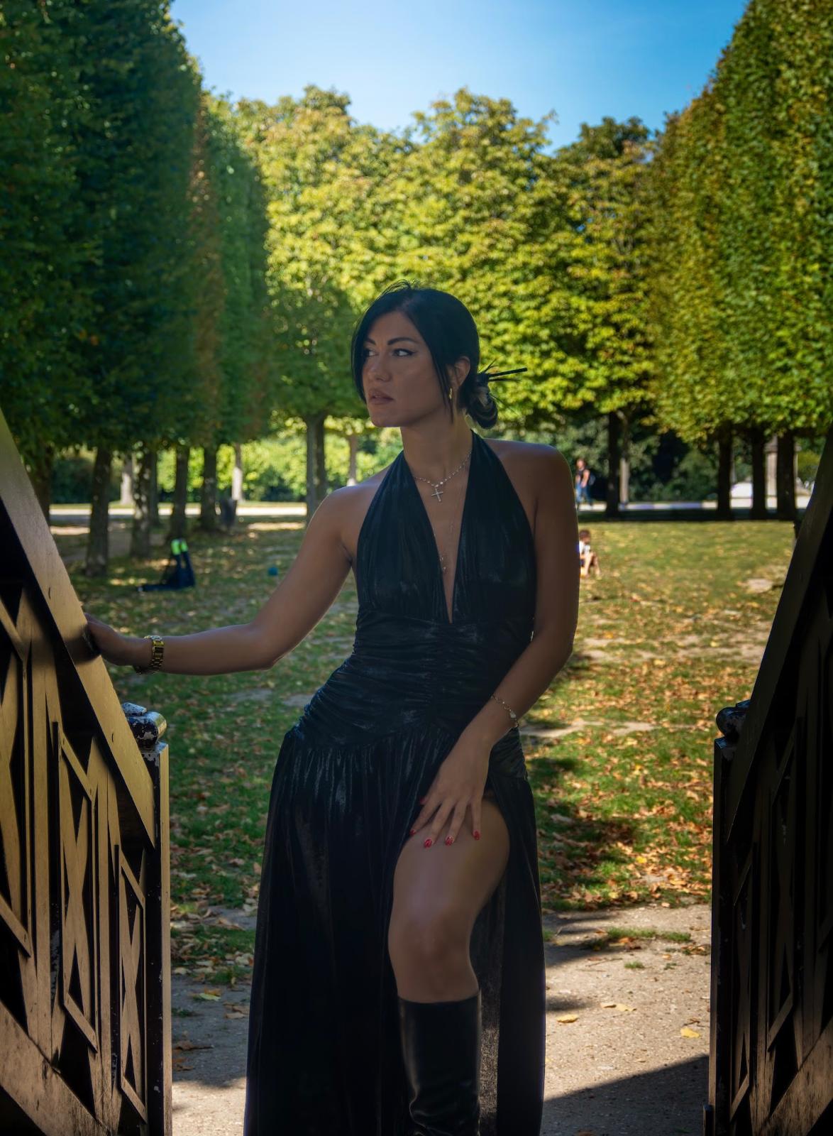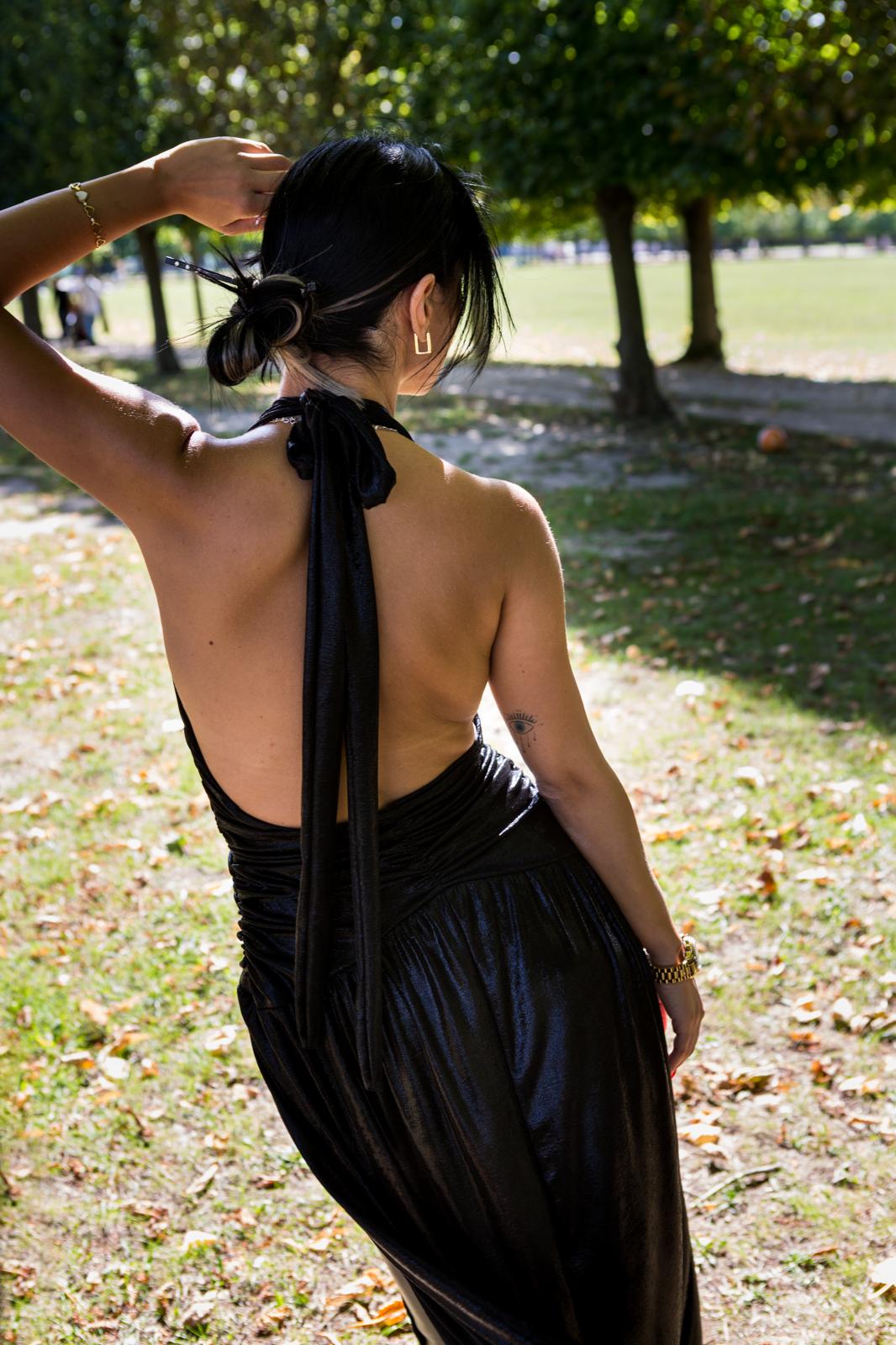 Abito nero in tessuto laminato, con ampio scollo a V, arricciato in vita, ampio spacco laterale e schiena scoperta.