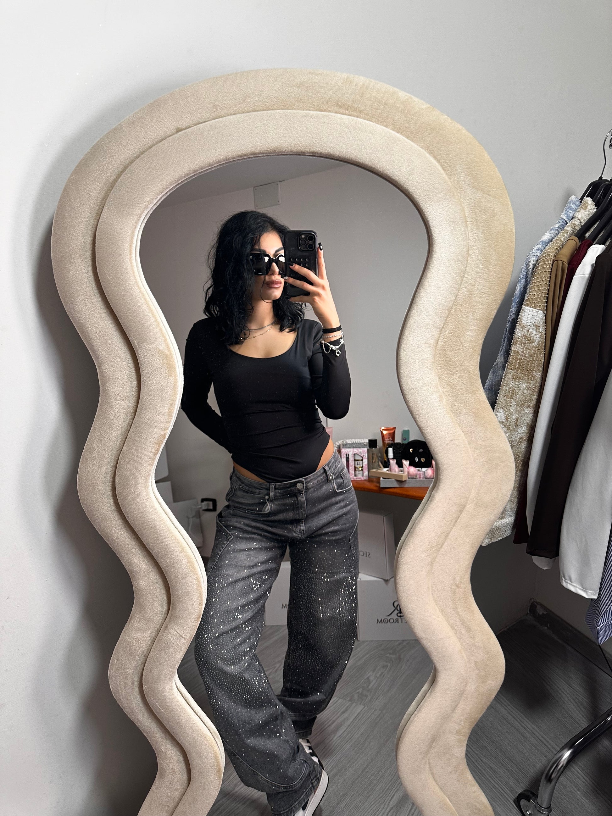 Jeans modello baggy a gamba larga in denim di colore grigio con strass. La vestibilità è comoda ideale da indossare sia a vita alta che bassa.