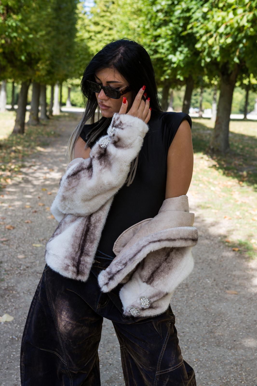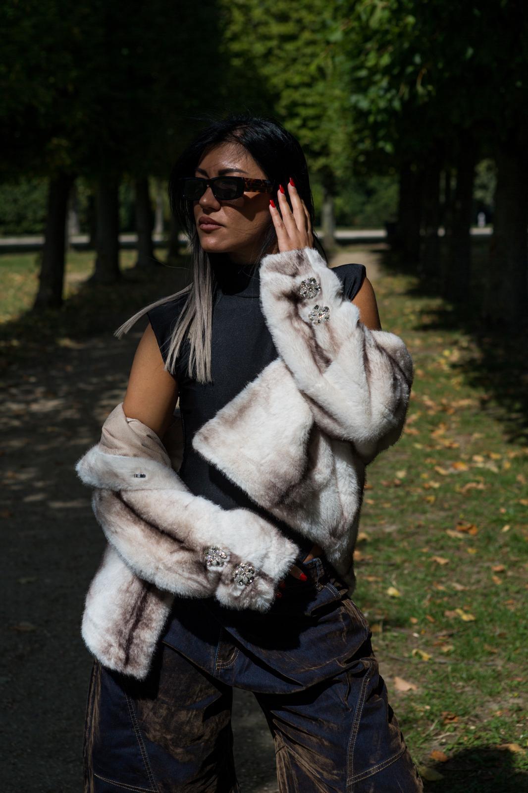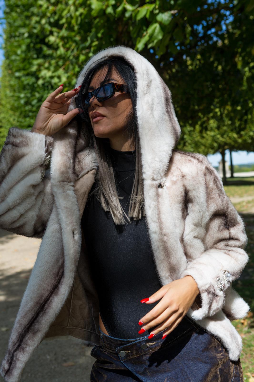 Pelliccia bianca con sfumature marroni, bottoni gioiello lungo le maniche e abbottonatura gioiello all'altezza del petto. Vi è presente anche il cappuccio ed è foderato in velluto.